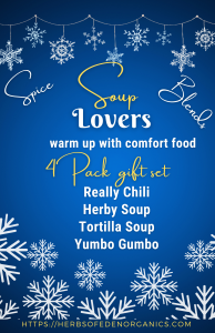Herby Soup: Ingredients: Garlic & onion powder, marjoram, oregano, thyme, turmeric, basil, ginger, fenugreek, black peppercorn.
