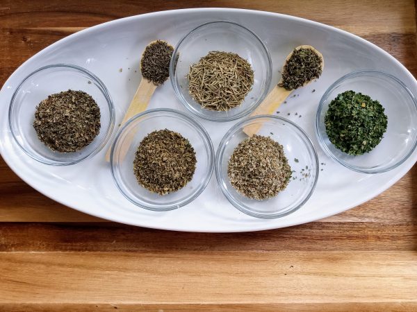 Basil, Rosemary, thyme, marjoram, oregano, chervil, parsley, turmeric, lemon pepper, paprika, black pepper, ginger