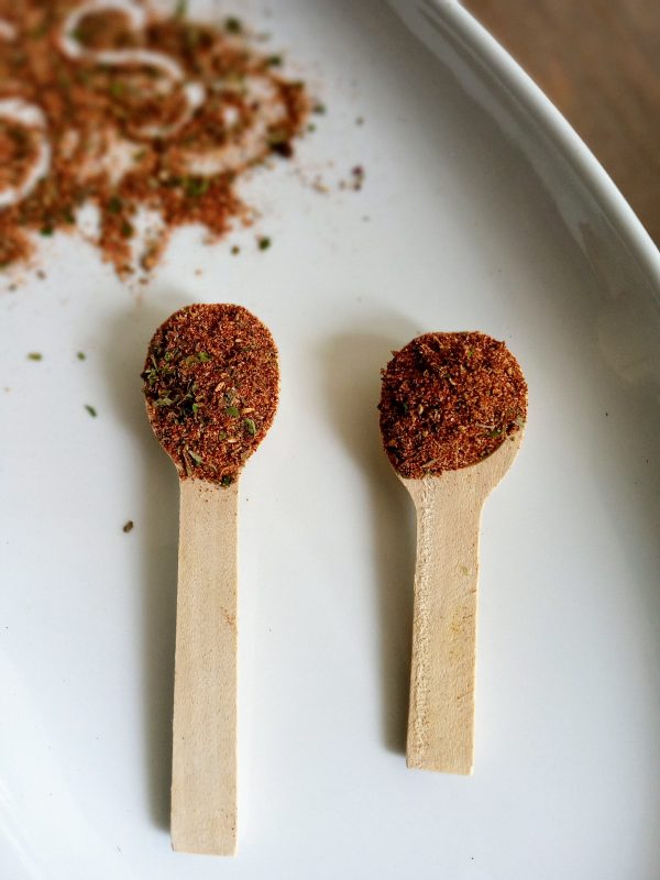 Ingredients: Dried thyme, smoked paprika, roasted coriander seeds (grounded), roasted cumin seeds (grounded), smoked black peppercorn, granulated garlic and onion, basil, cilantro, parsley, ancho chili, red pepper flakes, cayenne.