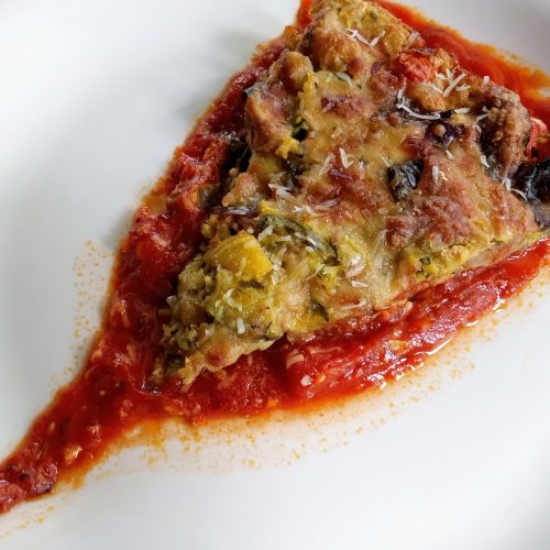 I often create recipes or meals on a whim, and this is one of them. You gotta try this pizza. It’s jammed packed with veggies and held together with mozzarella cheese, served with an herby garlicky red sauce, with a hint of sweetness. The crust is made with chickpea flour, nutritional yeast, herbs and garlic. The spice blend used in this dish was Just Herbs.