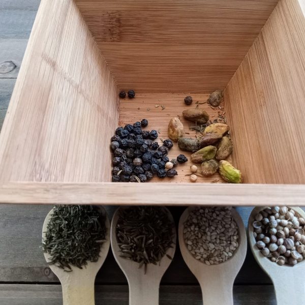 Ingredients: Dried basil, curry powder, granulated onion and garlic, coriander, fenugreek, parsley, turmeric, ginger, paprika, dried tarragon, dried marjoram, black peppercorn.