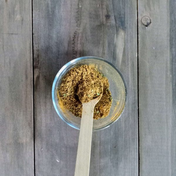 Ingredients: Garlic & onion powder, marjoram, oregano, thyme, turmeric, basil, ginger, fenugreek, black peppercorn.