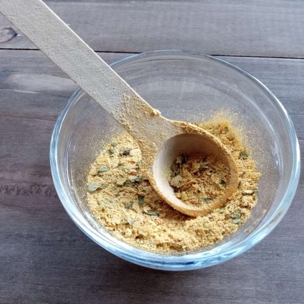 Nutritional yeast, granulated garlic and onion powder, dried oregano, dried cilantro, turmeric, red pepper flakes
